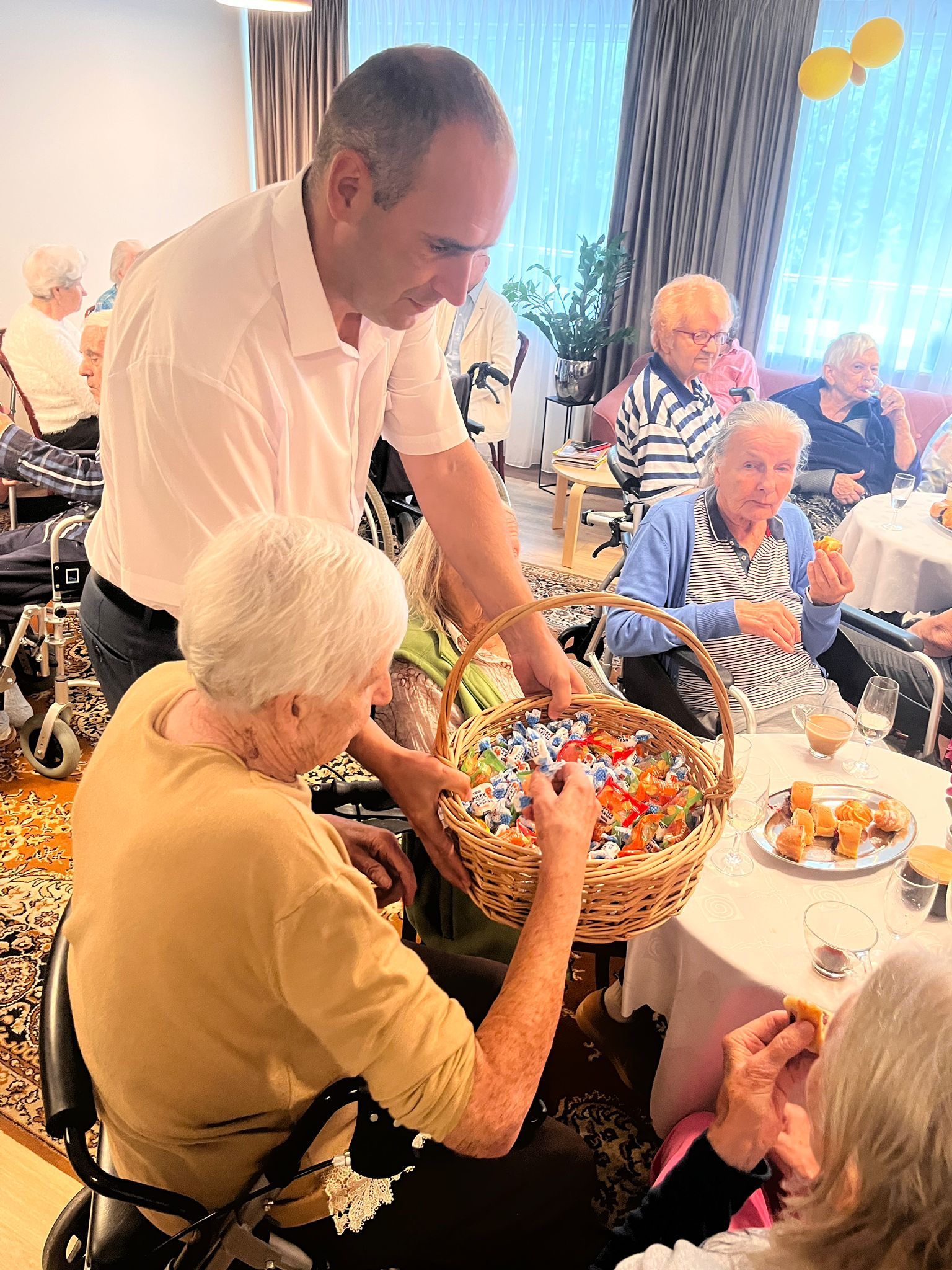 Były serdeczne życzenia od mieszkańców i pracowników, szampan, pyszne ciastka oraz uśmiechy, które rozświetliły całe popołudnie 🌸💫. Pan Dyrektor nie zapomniał również o słodkich upominkach – każdy mógł poczęstować się cukierkiem 🍬.