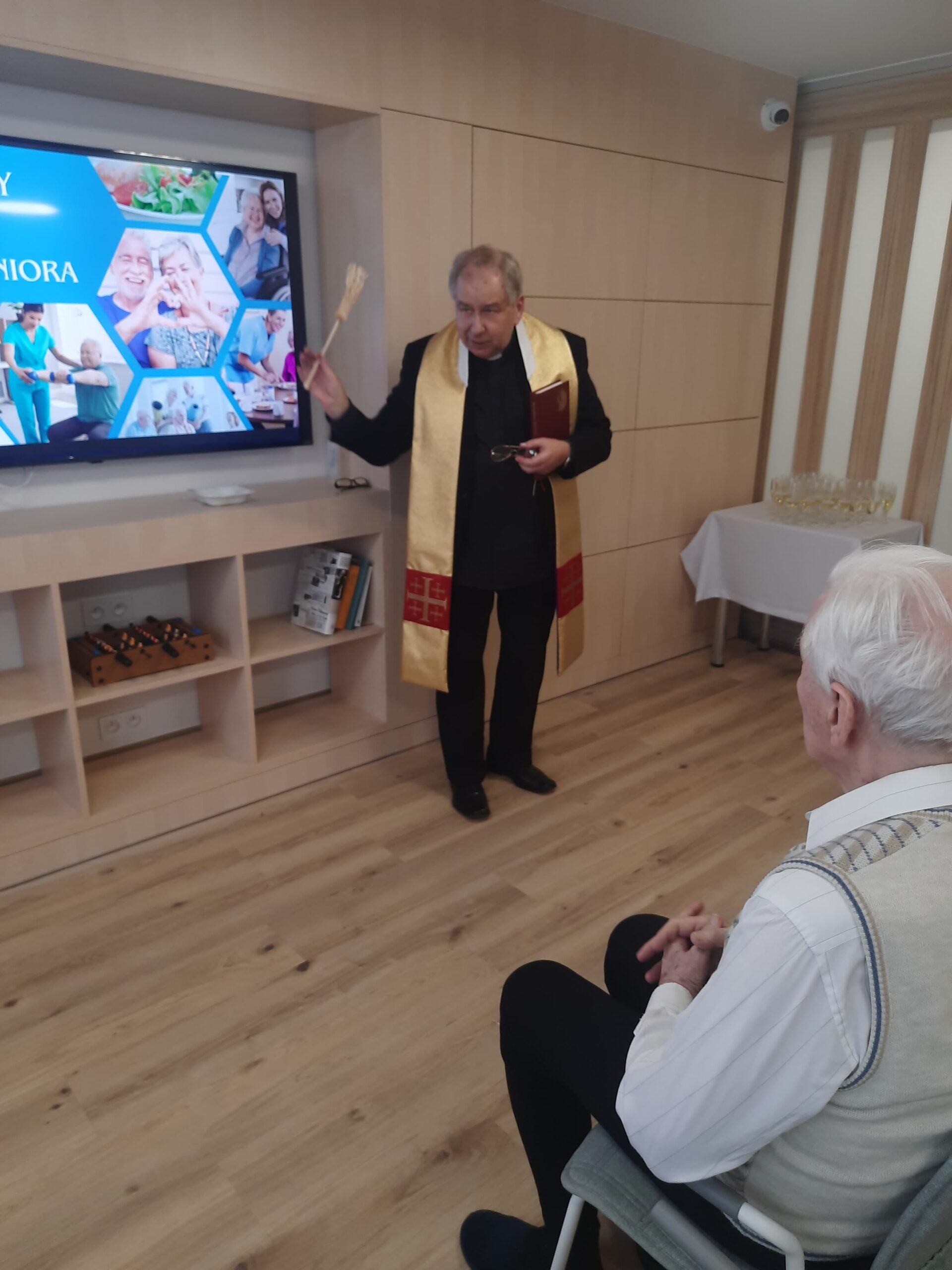 Uroczystość rozpoczął Pan Dyrektor Jacek Szostakiewicz, który powitał pensjonariuszy, pracowników oraz zaproszonych gości specjalnych. Pan Dyrektor na podstawie multimedialnej prezentacji przedstawił kolejne etapy przeprowadzonego remontu i jego efekty. W prezentacji zawarte były także cele działalności naszej placówki oraz ambitne plany rozwojowe. Hasło prezentacji „Rozwijamy się dla Was” najlepiej oddaje powód, dla którego Pan Dyrektor oraz pracownicy wszystkich działów podejmują trud pracy na rzecz poprawy komfortu i jakości życia naszych Seniorów. 💖
