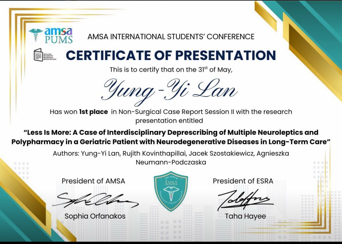 📣 Efektem wspólnej pracy są również nagradzane wystąpienia na międzynarodowych konferencjach – m.in. 1. miejsce w sesji case report na AMSA International Students’ Conference 🏆👏